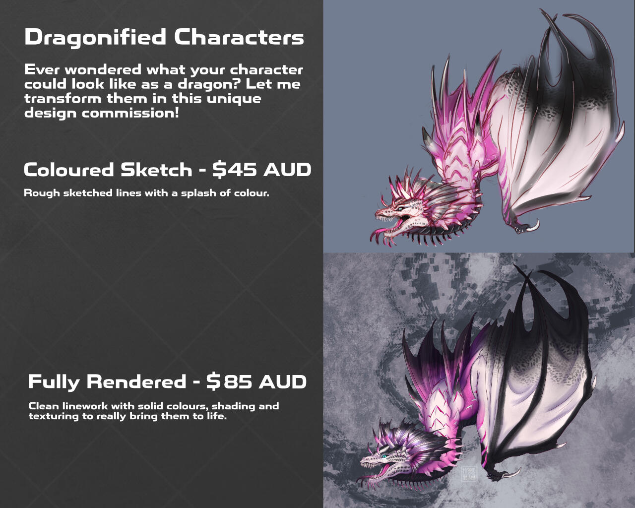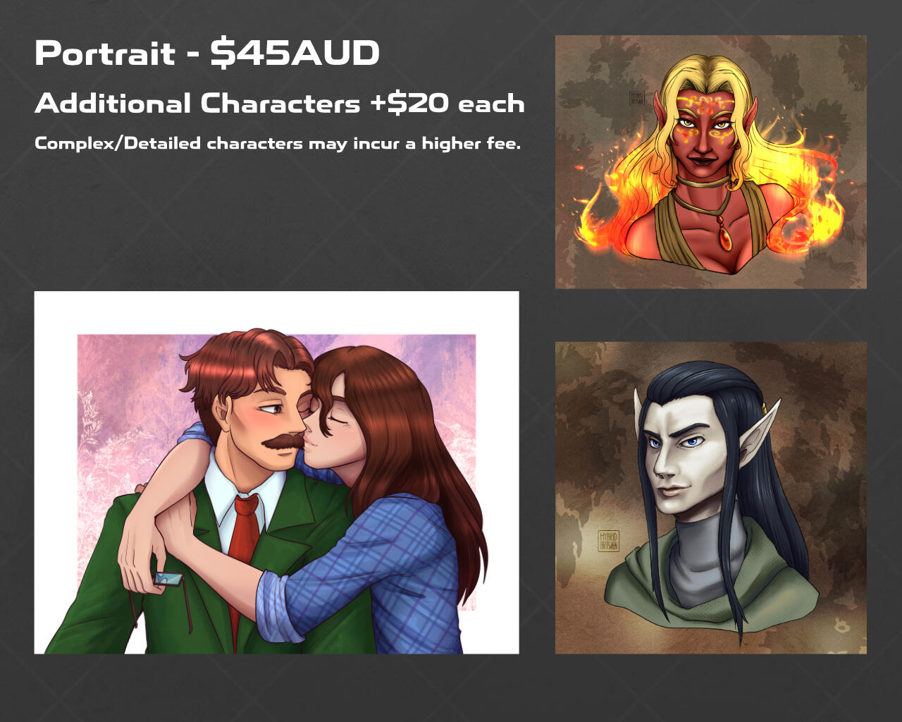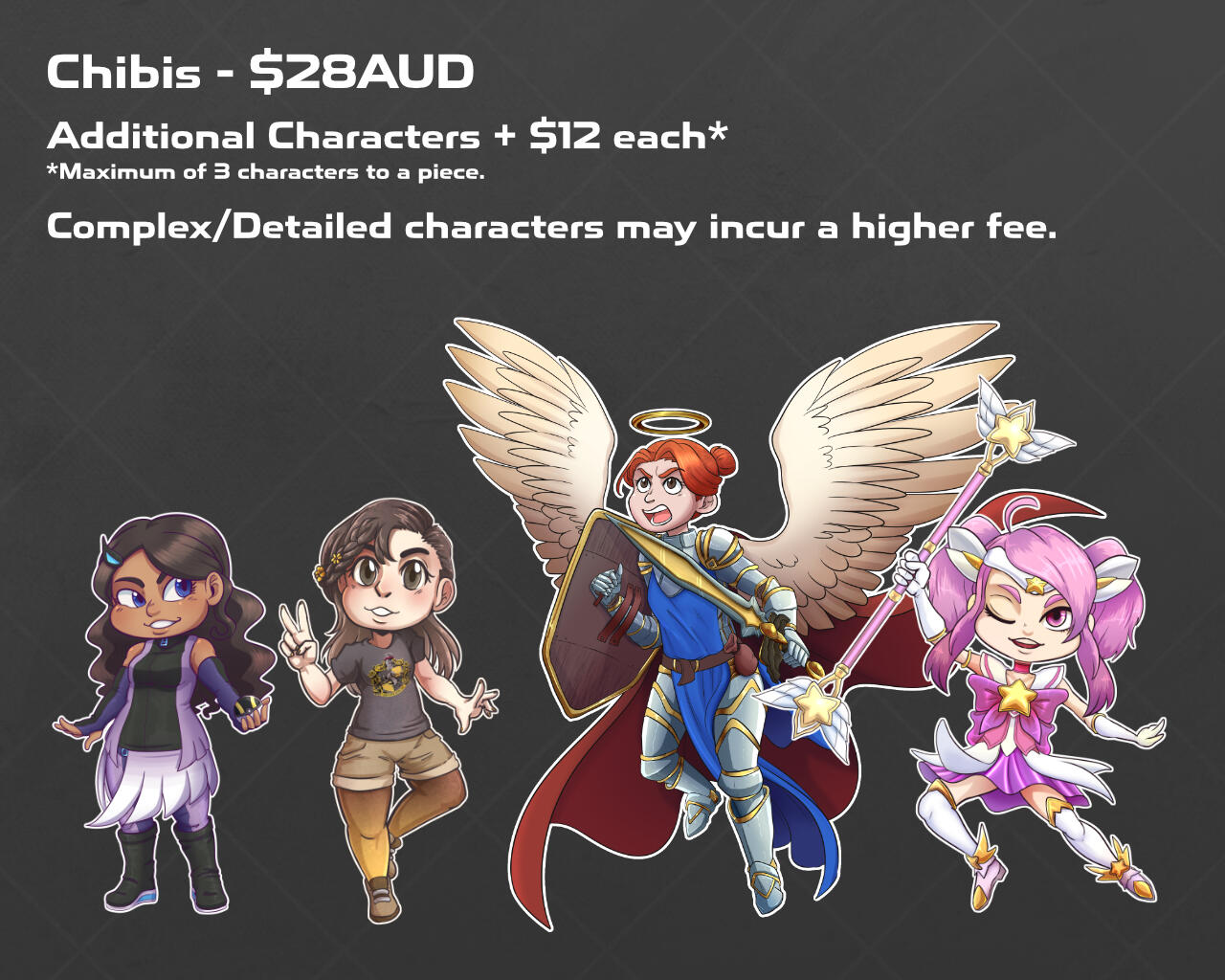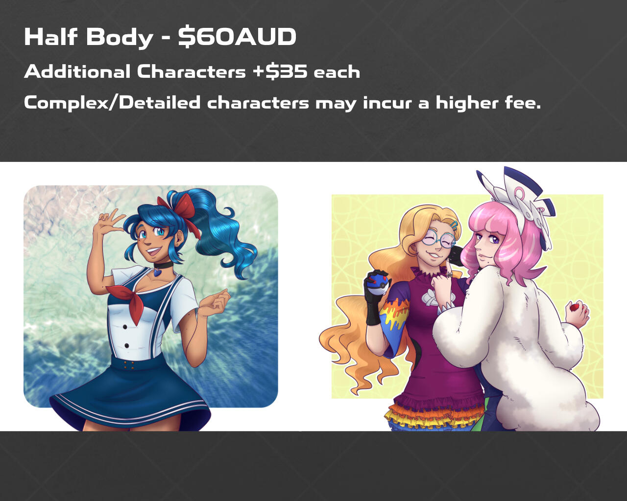 Prices below are starting prices only and will increase depending on the complexity of the character and the number of elements included in their design.If you do not already have art of your character to use as a reference, this will automatically classify your commission as a character design. This is to account for the extra work involved in crafting a character from scratch using multiple example images and/or descriptions.Please DO NOT claim and use someone else's design as your own.BASIC - $100AUDIncludes all humanoid characters with basic outfits with no or small/simple accessories. Characters with small horns or animal ears may be included in this category.BASIC + - $150AUDIncludes all humanoid characters with multiple outfit components or outfits with some finer details such as patterns, laces, belts etc.