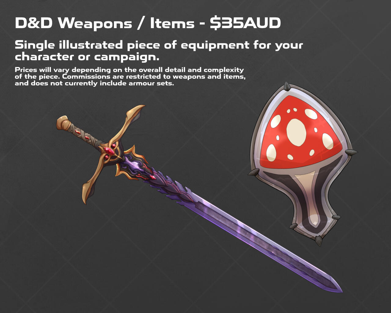 Characters can have one simple weapon or two smaller weapons (daggers/pistols), and/or accessories.COMPLEX - $200AUDIncludes all humanoid and monster race characters; characters with multiple outfit components and armour sets; large and/or multiple weapons and accessories; large wings, tails, and/or additional body-parts.