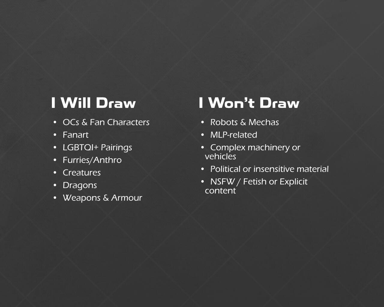 Currently trialling a new information layout. If you're having trouble loading the images, try viewing the commissions PDF here.